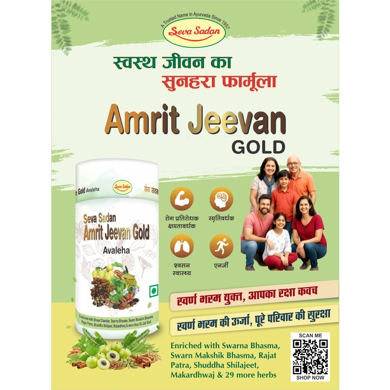 Seva Sadan Amrit Jeevan Gold Avaleha is a premium Ayurvedic health tonic enriched with Swarna Bhasma, Makardhwaj, Shuddha Shilajeet, and over 28 potent herbs.