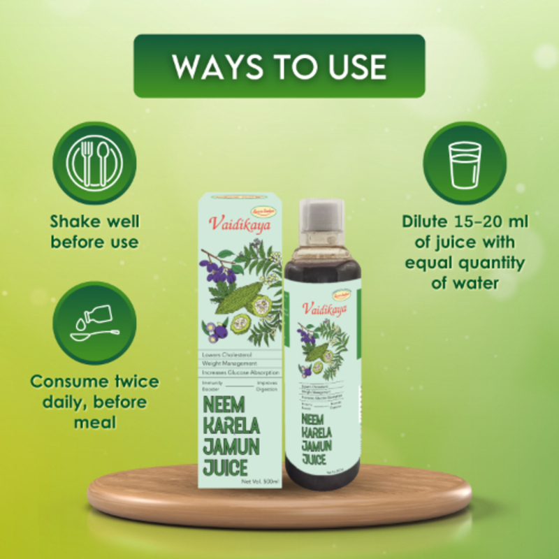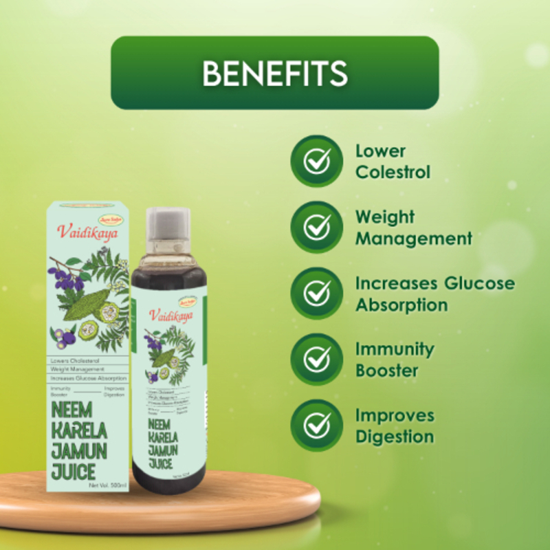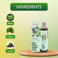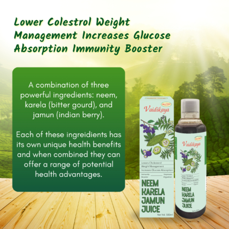 Neem Karela Jamun JUICE IS a combination of three powerful ingredients :neem,Karela(bitter Gourd),and Jamun (indian berry) Each of these ingreidients has its own unique health benefits and when combined they can offer a range of potential health advantages Karela contain compound that act like insulin ,while jamun helps insulin to improve insulin sensitivity. Neem Control Blood Sugar.